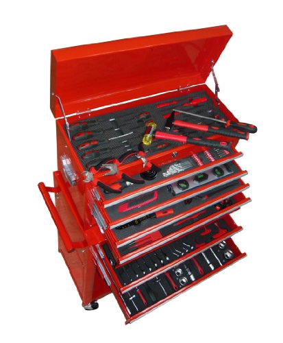 Ce chariot à outils est rempli d'outils dont vous avez souvent besoin. Avec ses 7 tiroirs, remplis de plus de 250 outils différents, Ne plus trouver l'outils adhoque deviendra impossible. Vous disposerez de tous les tournevis, marteaux, clés de mulltiples tailles ansi que tous les outils indispensables. Les outils sont en Chrome Vanadium C45 fer et le chariot est en tôle d'acier . Si vous utilisez ce chariot dans votre atelier, grange ou autre, il est bon de savoir que les roulettes sont là pour vous alléger le travail !