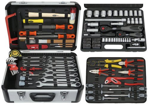 - Assortiment très complet avec 5 pinces, 2 marteaux, 7 tournevis, 15 clés à fourche polygonales 6-22 mm, 10 clés six pans, 2 testeurs de tension, 3 limes, etc.