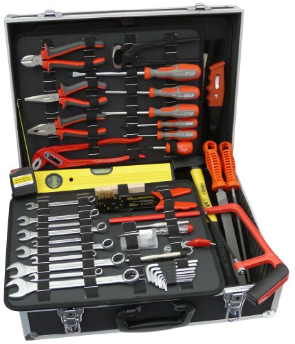 - Assortiment très complet avec 4 pinces, 1 marteau, 6 tournevis, 10 clés à fourche polygonales 6-19mm, 8 clés six pans, 2 testeurs de tension, 2 limes, etc.