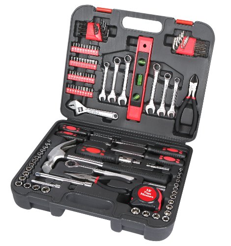 - Also includes wrenches, pliers, hammer, torpedo level, tape measure and four screwdrivers.