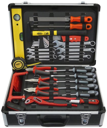 - Assortiment très complet avec 4 pinces, 1 marteau, 5 tournevis, 10 clés à fourches polygonales 6-19 mm, 8 clés 6 pans, testeur de tension 230 V, 2 limes, mètre-ruban, etc.
